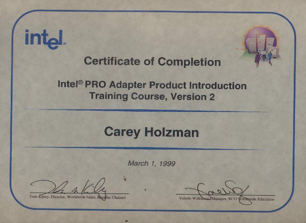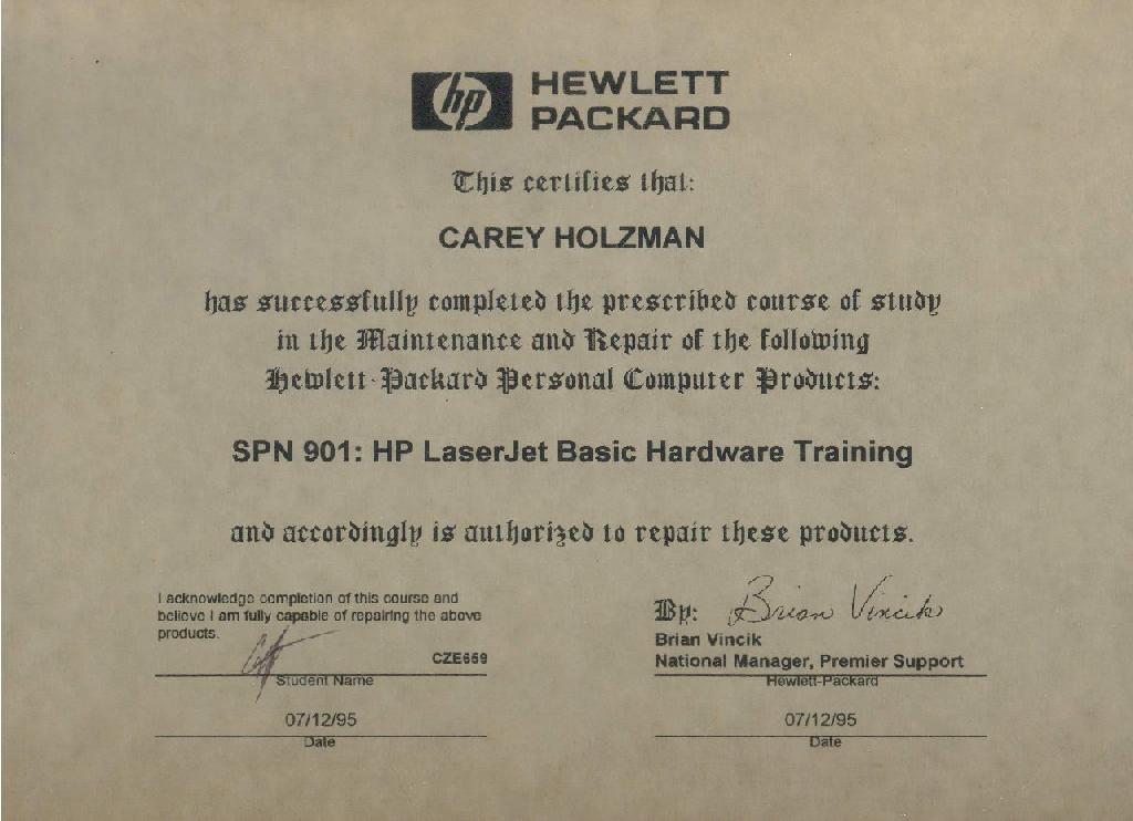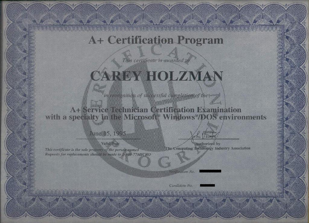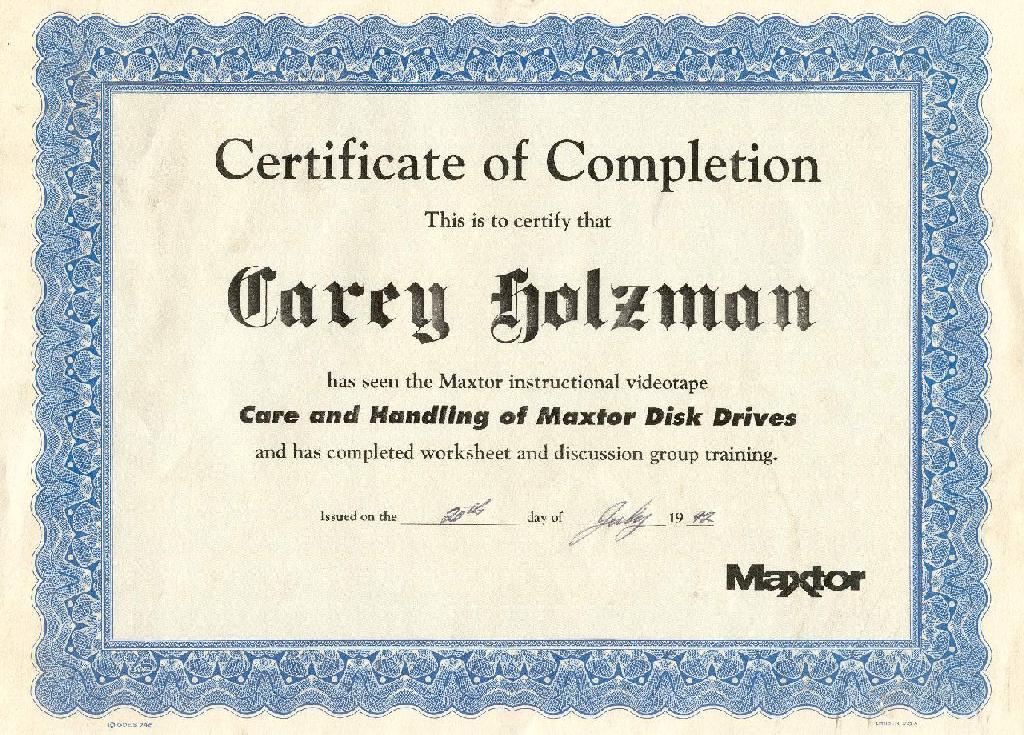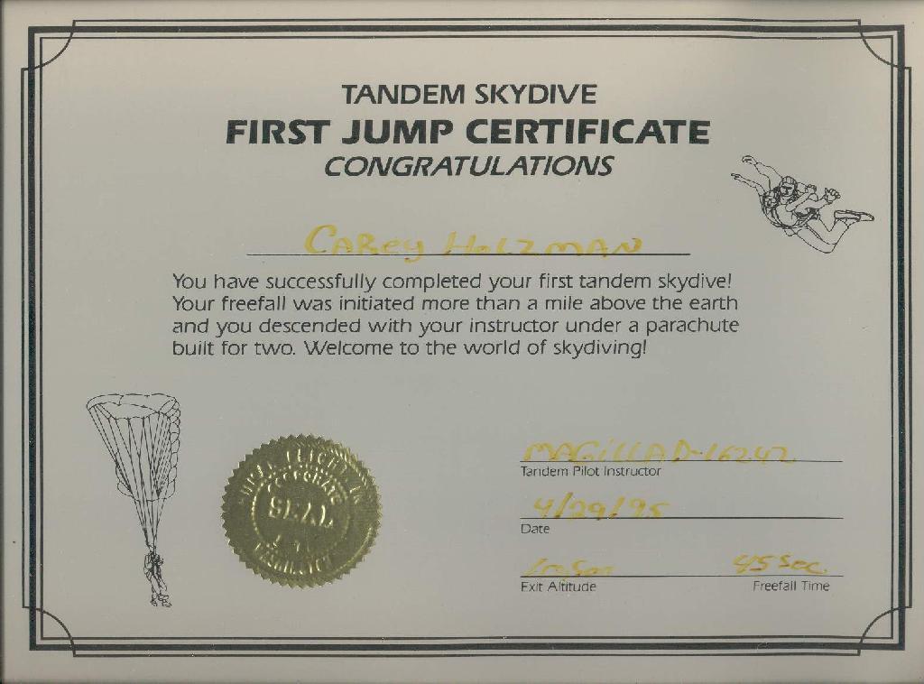 Skydive First Jump Certificate, April 29, 1995. (From 10,500 feet, 45 second freefall).