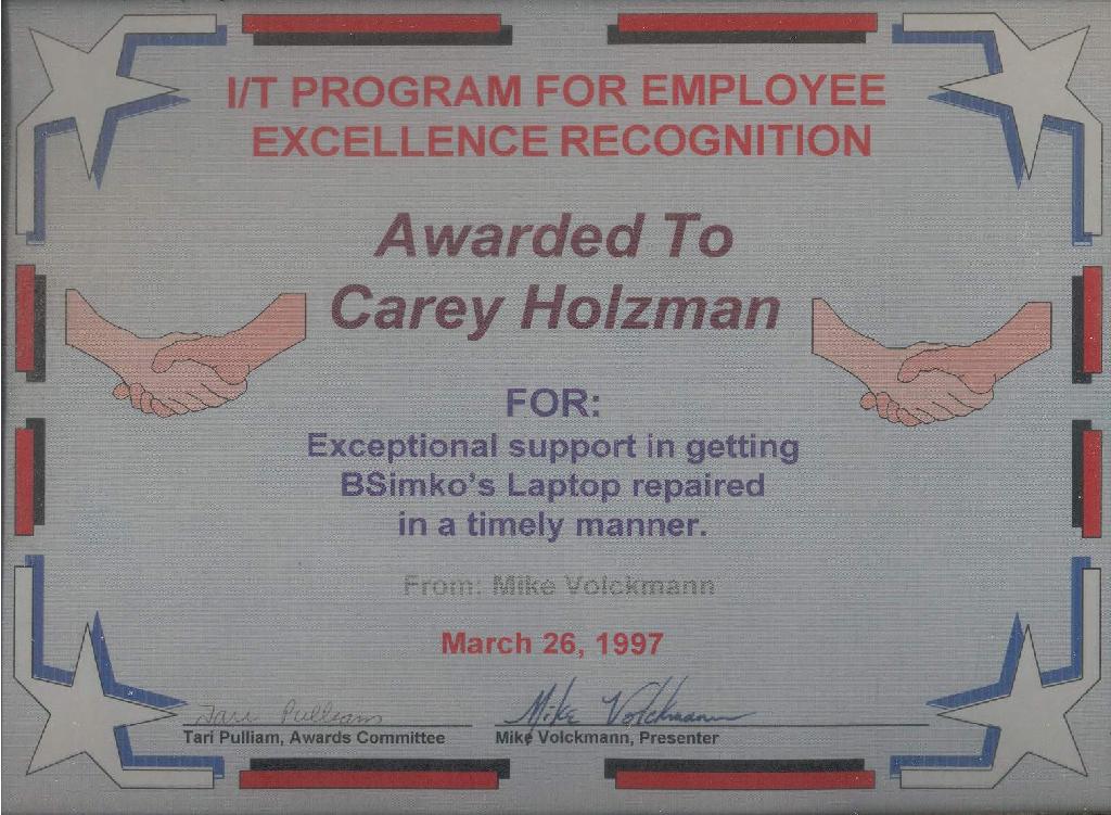 Special Recognition Award from Tri-Star Computer Corporation, 1991.