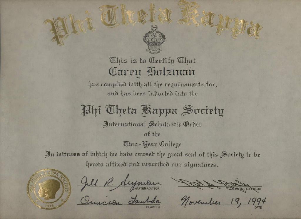 Member of Phi Theta Kappa Society, November 19, 1994. (Honor Society for two year colleges).
